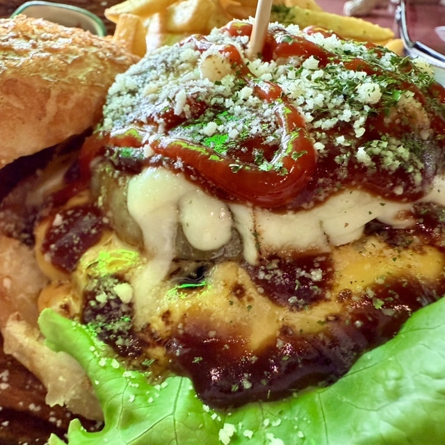 山ビールと海ビールがあり、メインはビッグサイズのハンバーガーやピザなので、心ゆくまで熱々のおいしい肉汁を堪能できます。